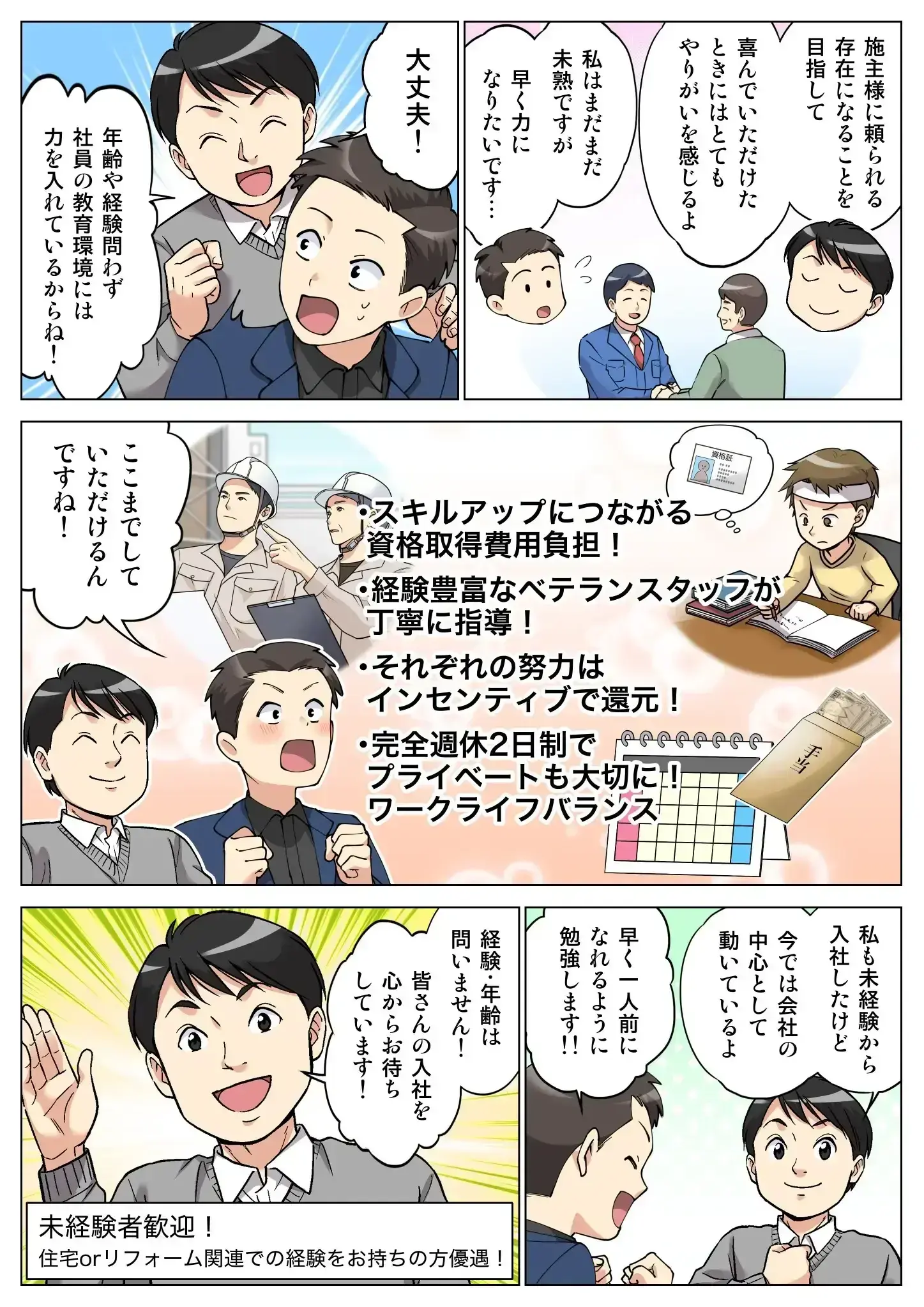 施主様に頼られる存在として成長できます。一人ひとりを大切に評価し頑張りを還元できる環境を用意していますので、ご安心ください。一から経験を積みたい方も歓迎します。